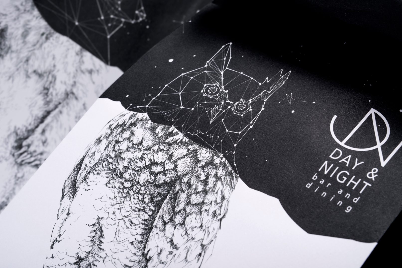 The branding concept expresses the restaurant type that serves its dining during the day and the bar starts to act in the night. This duality of the restaurant living is clearly expressed in the pictured animals, illustrated in two different polarities.