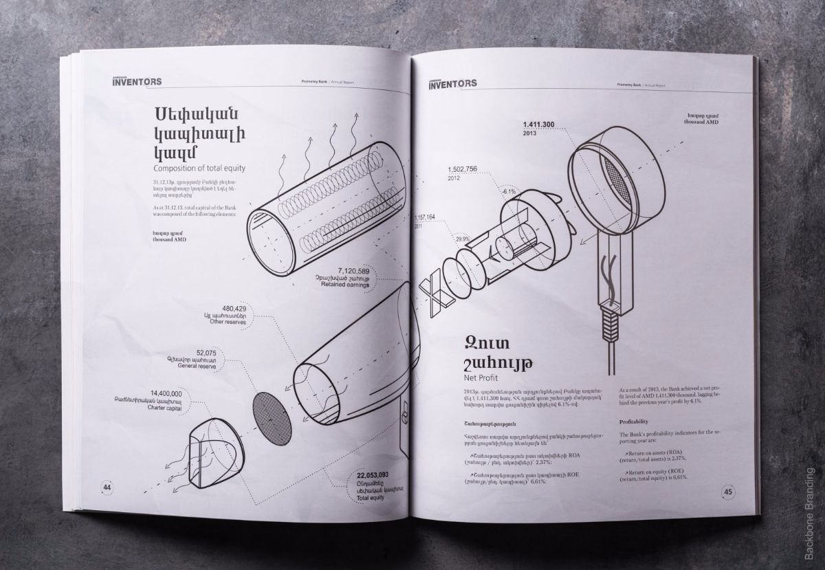 The annual report was conceived to be an imaginary magazine, where the inventors are presented as the covers heroes and the illustrations include the numbers of the patent claim of the mentioned invention.